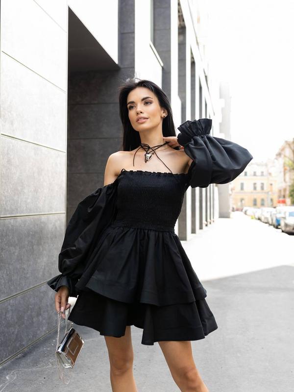 Льняное короткое платье с пышной двойной юбкой открытыми плечами