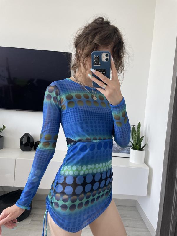 Платье туника сетка на купальник пляжная летняя прозрачная яркая платье синее на затяжках...