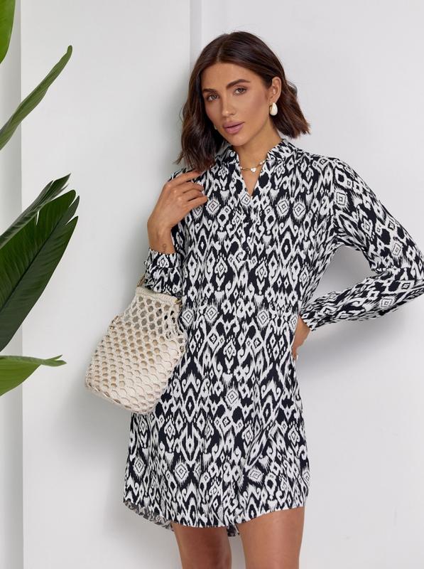 Свободное платье-рубашка из принтованного хлопкового штапеля черно-белого цвета. Модель короткой асимметричной длины с прямым кроем и длинными рукавами. Платье с небольшой планкой на пуговицах и воротником-стойкой.