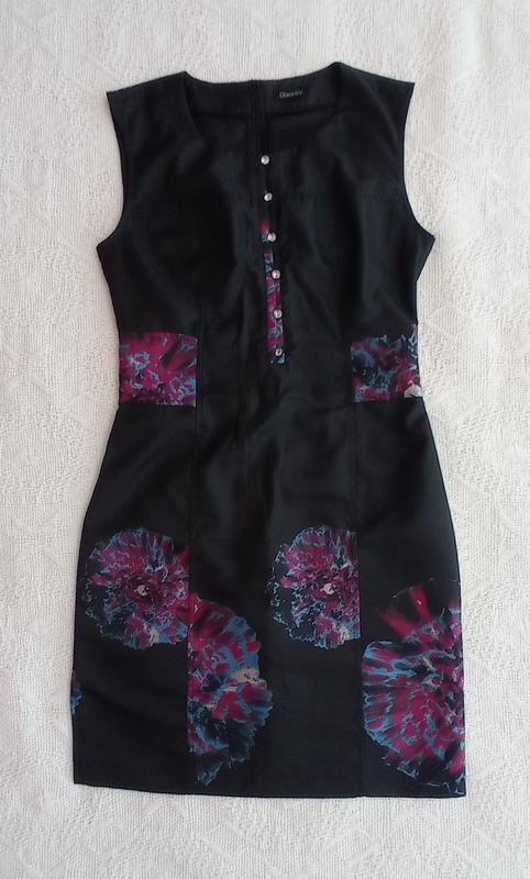 Черное платье в структуре сине-сиренев цветы. Ткань не тянется, по спинке молния, спереди пуговицы тоже расстегиваются. Без подкладки. Талия 37 см, грудь 43, бедра 47, длина 90. В подарок к любой покупке на моей странице.