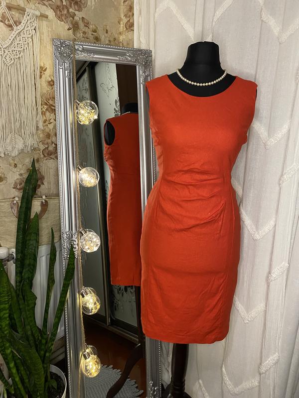 Платье-футряр в ярко-оранжевом цвете, состав вискоза и лен, на подкладке, имеет сзади распориху и сзади закрывается на молнию Состояние - идеальный Размер - М Полуобхват груди - 42 см. Полуобхват талии - 39 см. Полуобхват бедер - 47 см. Длина - 93 см.