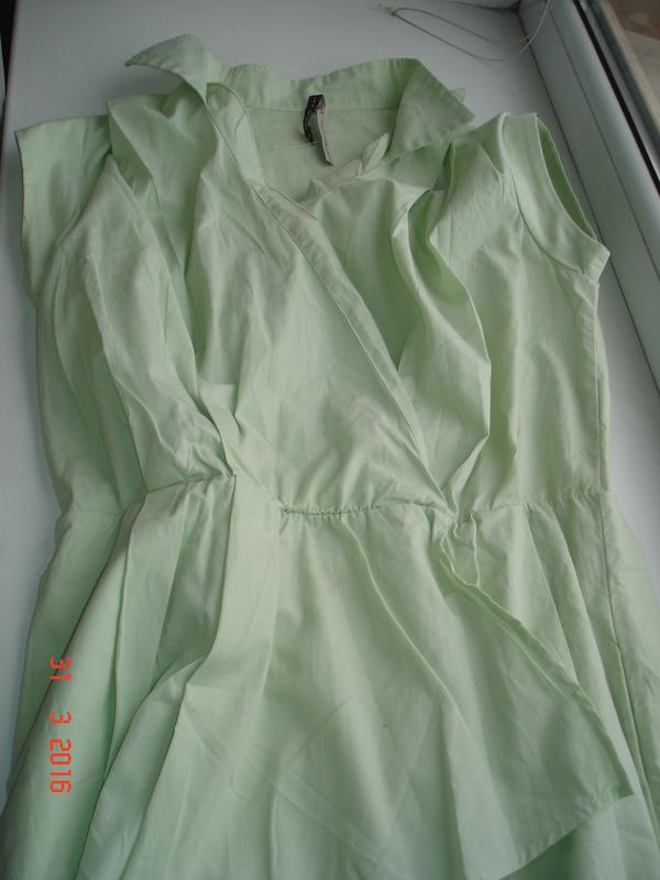 Оригинального фасона, в новом состоянии (меряла, вымазала помадой , пришлось постирать, не носила), итальянское платье, нежно-мятного цвета на подкладке из трикотажного коттона. Дорогой состав ткани- 70% коттон и 30% шёлк, с характерным для шёлка блеском. Два действующих кармана, на запахе, , оригинально выполнен верх с элементами асимметрии, сзади тоже асимметричная складка на спинке. Платье универсальное- можно носить повседневно, но можно и как вечерний вариант с каблуком. Указан размер 42, замеры:ПОГ -52 см, ПОТ -40 ( отрезное с резинкой), ПОБ -50 см, длина лифа до талии -резинке -39 см, плечи - 40 см. На фото размер М , рост 170 см.Смотрите мои объявления, много интересных вещей.