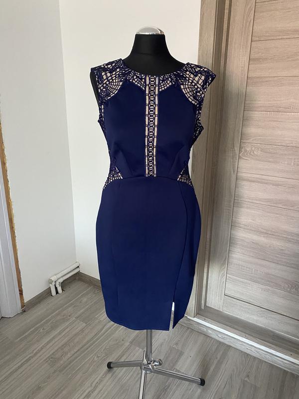Платье темно-синего цвета из трикотажа, декорированное дорогим кружевом, выглядит стильно и за счет вставок очень красиво струится.