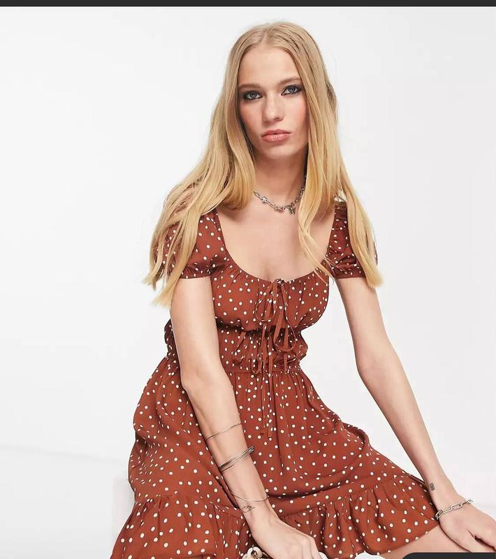 Замеры: Длина 80см; ПОГ 44см (+5см); ПОТ 38см (+5см); ПОБ 56 см. Состав: 97% полиэстер, 3% эластан. Принт в горошек, квадратная горловина, завязывается перед, рукава буфы, обычная посадка