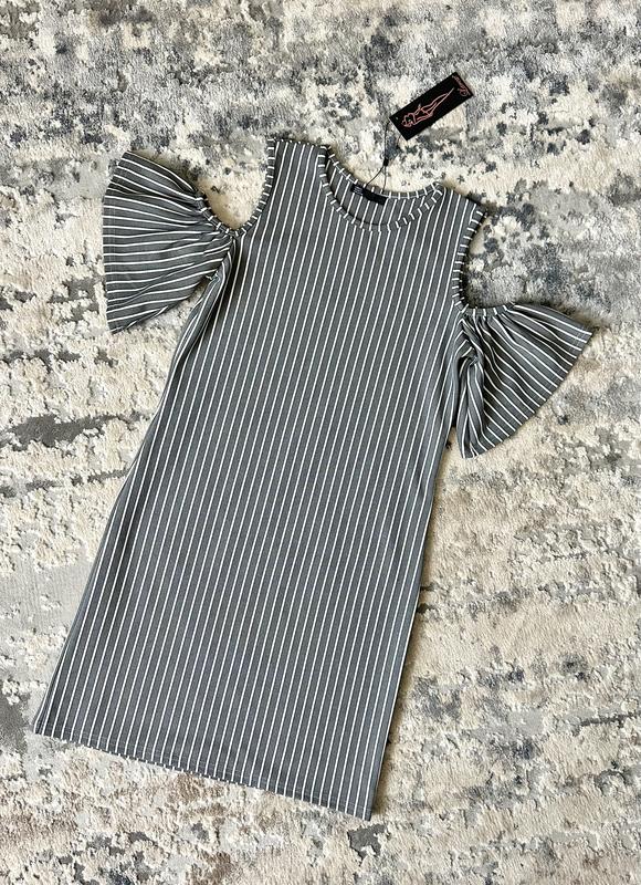 В наявності сукня сірого кольору в білу смужку з відкритими плечами . Рукав ліхтарик Розмір S Довжина 85 см Напів обхват грудей 45 см Напів обхват талії 37 см Напів обхват стегон 46 см Тканина тягнеться. Відмінна якість . Не мнеться.