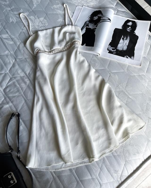 Красивое нежное платье 😍 Молочный цвет, имеет подклад, сзади застежка молния Изящное кружево, классно садится Размер: ХС-С Красиво на объем: грудь 88-93, талия 60-68, бедра 88-92 Состояние: 5+ требует стирки Грудь 38 см под грудью 34 см Бедра 54 см длина 90 см