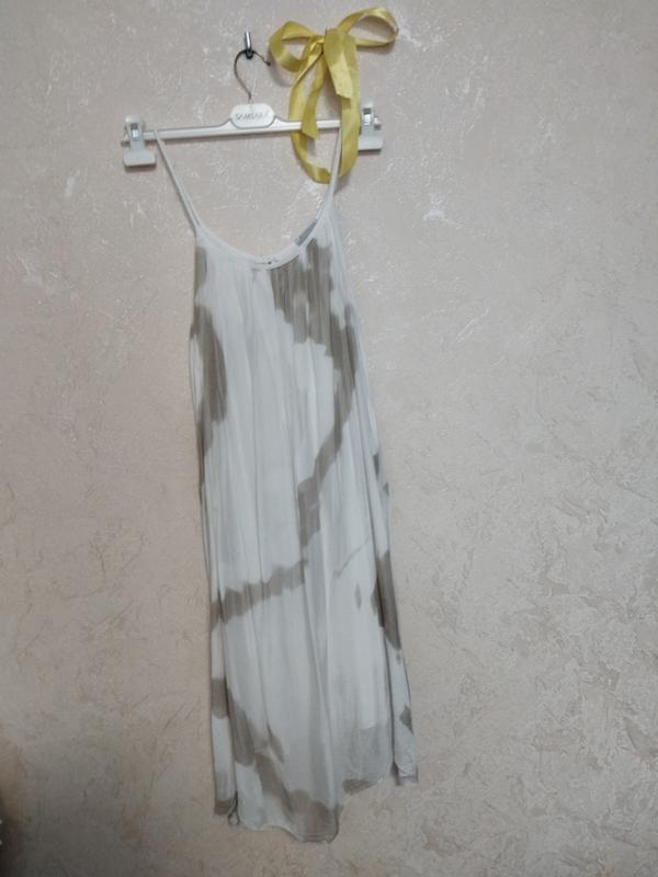 женское платье бело коричневого цвета, воздушное, легкое,е подкладка белого цвета.Длина от плеча-100, пог-48, ширина платья внизу-88, пот-66.