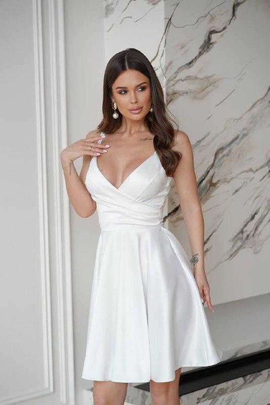 Розмір 42(S), 44(M) 46(L) Атласна сукня з довжиною вище колін, розкльошеною спідницею «сонце», з подвійними брителями. Давжина: 90 см Тканина: Атлас Кольори: чорна, молочна tiv