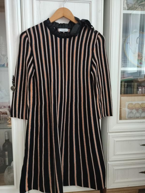 Платье от Max&Co, размер М, сезон осень-зима, современное, стильное платье, из прочного трикотажа, красивый фасон трапеция, на черном холсте, оранжевые и белые полоски геометрически расположены. Выглядит дорого. Длина платья 96 см, плечи 38, длина рукава 47, ПОГ 42, ПОТ 43, ПОБ 54, горловина хорошо украшена.