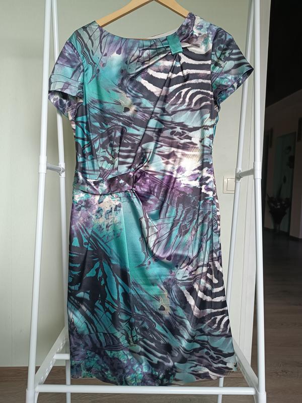 Необычайно красивое платье в цветах перьев павлина. Очень нежная шелковистая текстура ткани. Сдержанная, элегантная, но при этом яркая. Платье отлично подойдет и для офиса, и для праздника. Оригинальная драпировка подчеркивает достоинства фигуры и скрывает недостатки. Отлично сидит благодаря чехлу. Для удобства имеет застежку молнию до линии бедер. Длина 99 см. Полу объема: грудь 49 по спинке (впереди складки, можно больше) талия 42 стегна 50. Надела всего два раза на праздники. К сожалению, не прохожу теперь в бедрах.