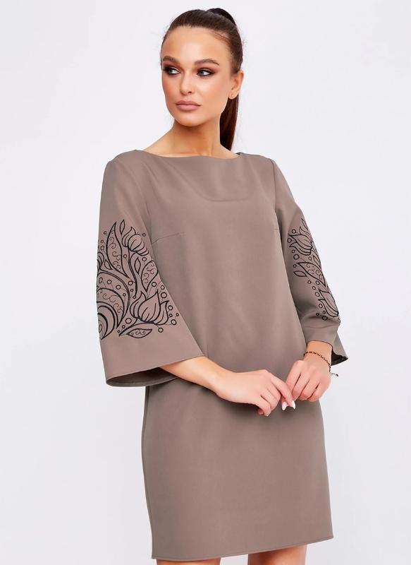 Платье прямое, сужение к низу, пышный рукав звон 3/4, втачной с вышивкой. Цвет кофейный. ОГ- 96, ОТ - 81, ОБ - 105.