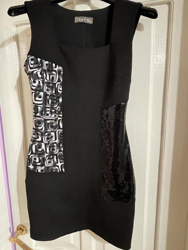 Черное платье в новом состоянии. Эффектный декор, классно подчеркивает фигуру. Размер 38 европейский (44 укр). Носилось на 36 размер.Замеры: грудь полуобхват 42, талия 34,5, бедра 43, длина 83.