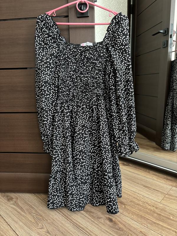 Очень красивое, легкое, стильное платье. Размер указан л, но идеально подойдет на м. На груди широкая резинка, книзу свободного кроя. Длина до колена. Платье одето один раз в фотосессию. Состояние новой.