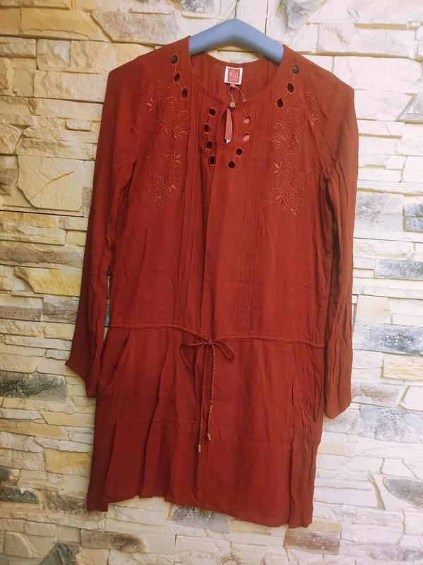 Гарна,легка сукня / туніка бренду Miss Captain,нова,оздоблена вишивкою, стягується шнуром ,є кишені, в оригіналі виглядає краще, ніж на фото, розмір 48, довжина 87 см, ПОГ 50 см, плечі 38 см.
