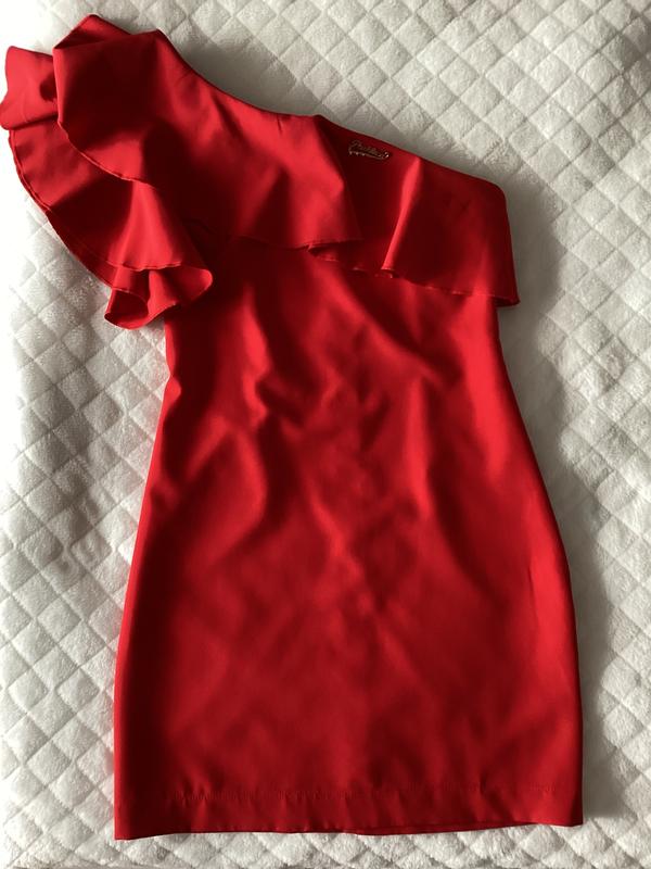 Очень красивое красное платье с оборкой на одно плечо!Размер -М(украинский).Полуобхват талии-36см;полуобхват бедер-46см!Длина платья-85смм