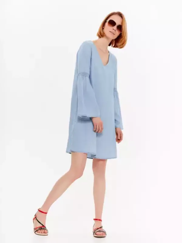 Платье с объемными рукавами, немного просвечивает, ткань 100% полиэстер, в идеальном состоянии. Длина от плеча 82 см, ПО груди 46 см, рукав 57 см.