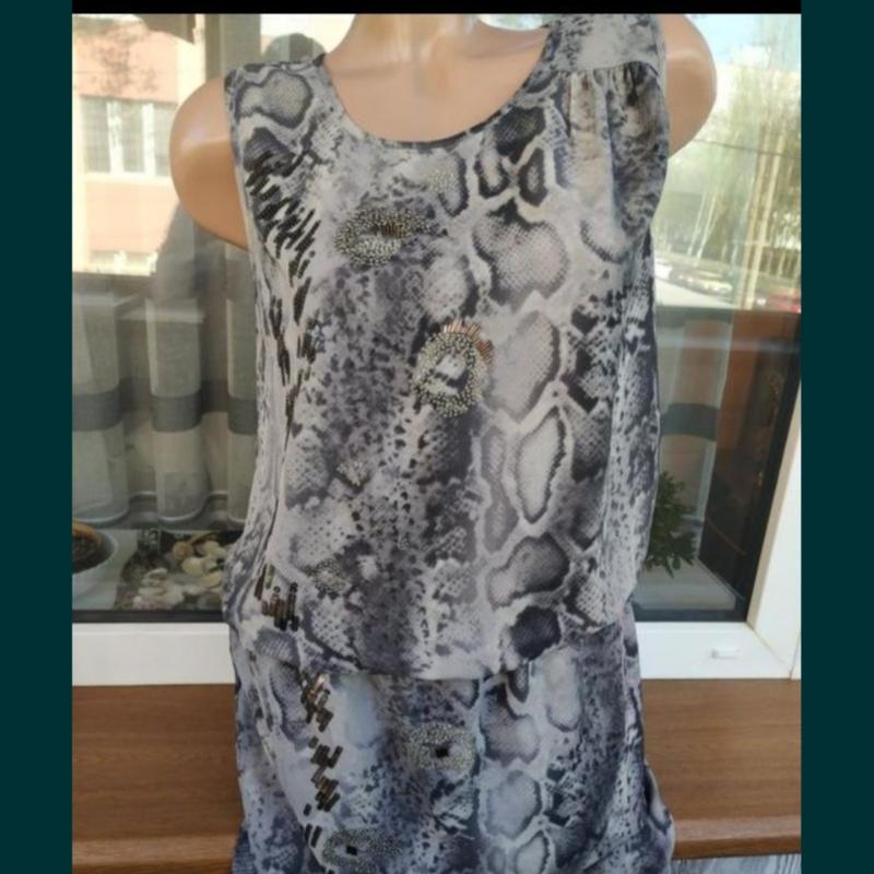 Шикарна сукня в питоновом принте, расшито биссером и пайетками. На талии на резинке, низ платья на подкладке. Длина платья 96см, ПОГ 49 см, ПОТ( без натяжения резинки) 40 см. Очень лёгкое, не мнётся.