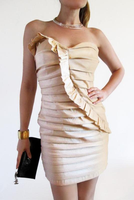 невероятное оригинальное платье, с мерцающей имитации тафты, форма - песочные часы. нежный бежевый цвет.Подкладка приятная к телу. На фото одета на размер M. но идеально будет смотреться на размер M -L. Качество ткани и пошив на высоком уровне.Замеры по запросу.Вращайтесь