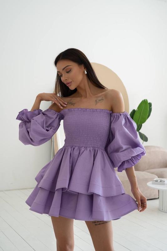 Сукня коротка міні фіолетова бузкова святкова пишна з пишним рукавом з відкритим и плечим...