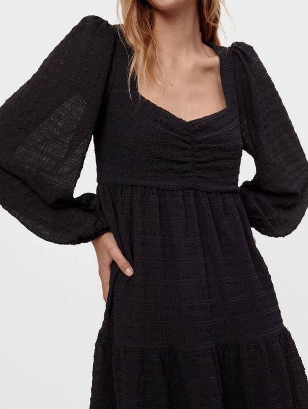 В продаже платье из текстурированной ткани, с очень красивой спинкой и объемными рукавами, размер указан М, но хорошо будет и на S длинна от плеча- 79см длинна рукава- 61см рукава на резинке не носилось,бирки сорваны