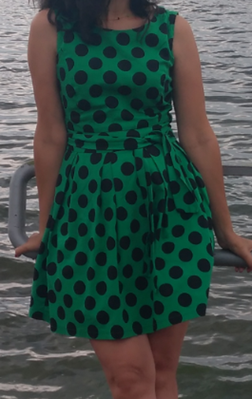 Продам очень красивое платье в горох. Размер 44, пот 32 см., длина 55 см. Смотрится очень красиво по фигуре.