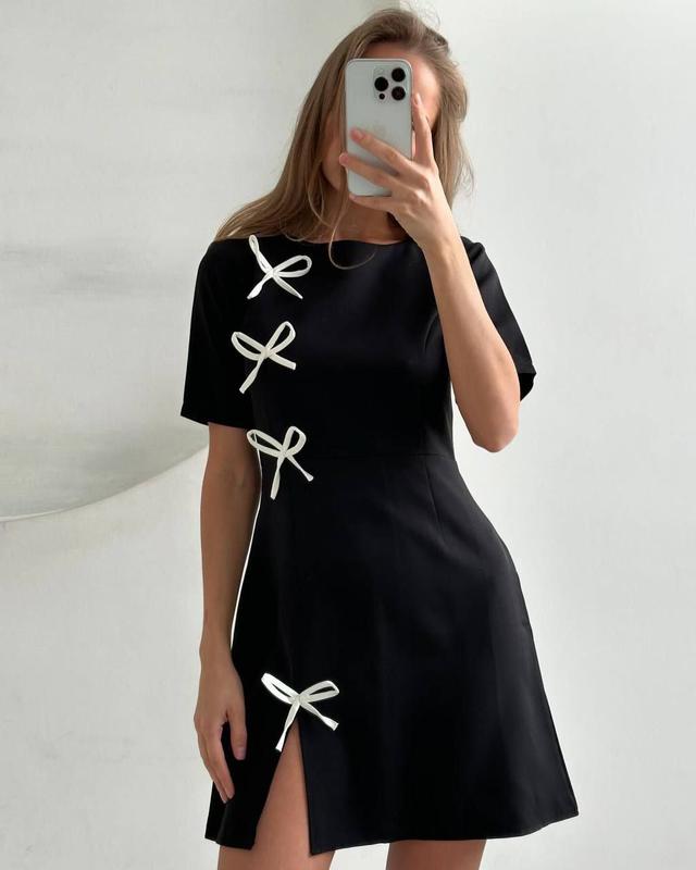 Платье декорировано актуальными бантиками, которые в тренде этого сезона. На спине молния. Это платье подчеркнет твою фигуру, будь в тренде всегда🩷 Мод: 334/45 Размер: 42-44, 46-48 Тканина: костюмка люкс Цвета: молочный, черный Цена : 790 грн