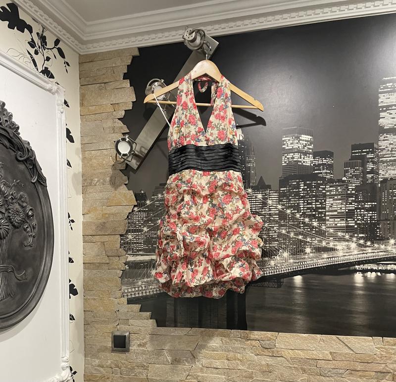 Гарна якісна ефектна сукня данійського бренду SisterS point,в квітковий принт,поєднання кольорів неймовірне,є підкладка,завязуєтьс на шиї ззаду,бічна прихована блискавка,розмір S,склад:25%котон;75%поліестер