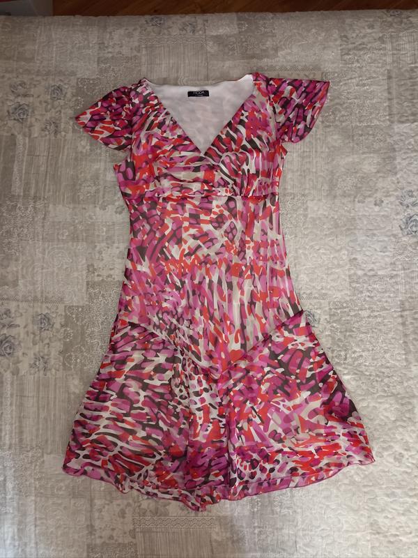 платье, платье Moda at George, шифон-жатка, на подкладке, на запах, абстрактный принт (молочный, серо-бежевый, коралл, розовый, фуксия, коричневый), размер Uk 16, EUR 44, грудь 100-106 см, под грудью 88-94см, бедра 100-112см длина 102см, длина рукава 17см сбоку для удобства молния 35см