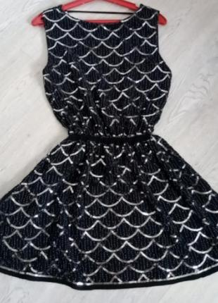 Платье мини платье черного цвета с открытой спиной отделки по всей ткани бисером и пайетками. Длина изделия 80 см, объем груди до 93 см, объем груди до 80 см (по талии пояс на резинке).