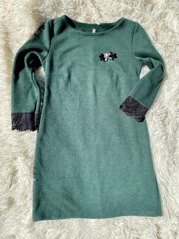темно-зеленое однотонное женское платье с длинным рукавом, по краям рукавов имеет вставки с кружевом, идет в комплекте с красивой брошью состояние новой, без дефектов или недостатков, однако нет бирки замеры: ПОГ - 42 см ПОТ - 45 см ПОБ - 45 см длина рукава - 49 см плечи - 38 см длина спереди - 75 см длина по спинке - 78 см Если у вас есть вопросы, то обратитесь в личные 🩵