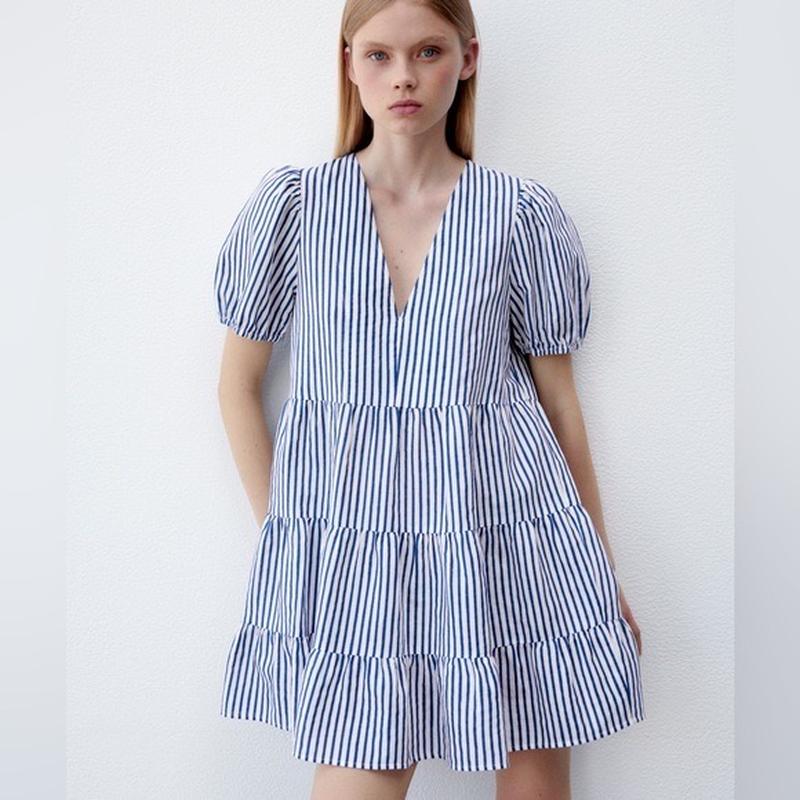 Летнее свободное платье с короткими рукавами-фонариками на тонкой резинке Zara из льняной смеси 52% лён + 48% коттон в полоску синего и белого цвета, с V-образным вырезом и короткими эластичными рукавами-фонариками. Конструкция пуловера, многослойная, свободный крой. Легкое Без изъянов. размер указан L Ориентируйтесь на дополнительные детали замеров: по плечам 36см, по подмышкам 52см, ПОГ 50,5см, ПОТ 49см( завышенная), длина рукава 26см, длина изделия 83см новое без бумажной бирки 🏷 и замечаний дополнительные детали замеров и фото спрашивайте.
