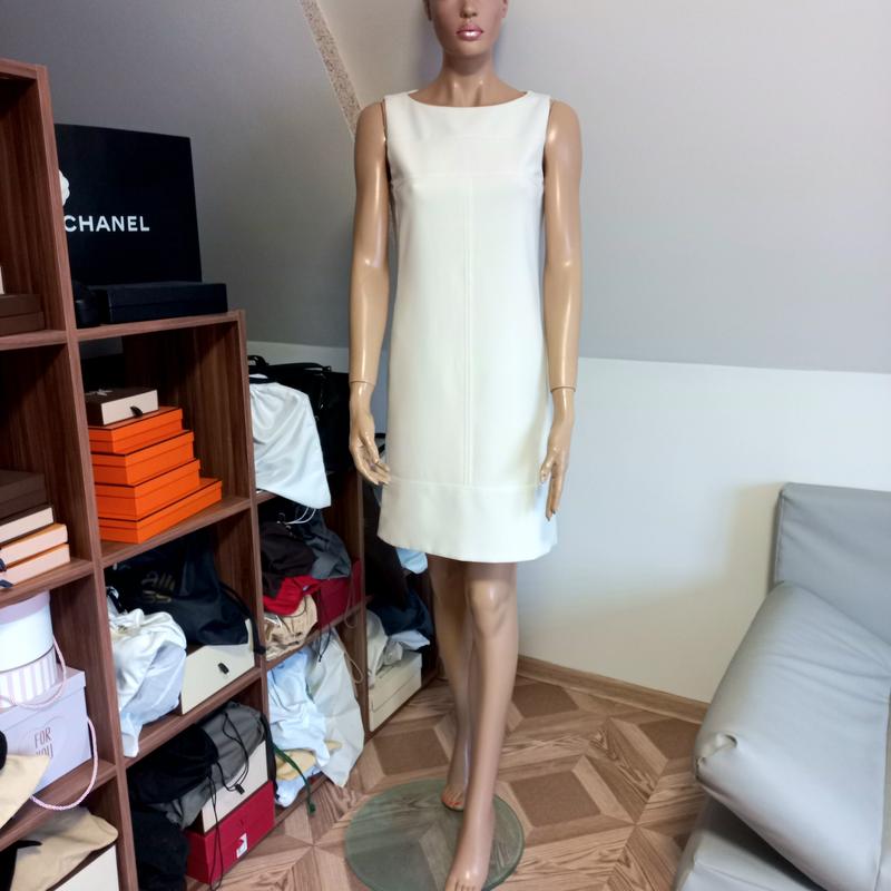 Marc Cain! Оригинальный! Молочное элегантное платье платья. Бирочка с составом и размером срезана, отлично будет на S/M. На подкладке. Стан идеален. Пог 45, пот 42, поб 49, ткань еще тянется, длина 96.