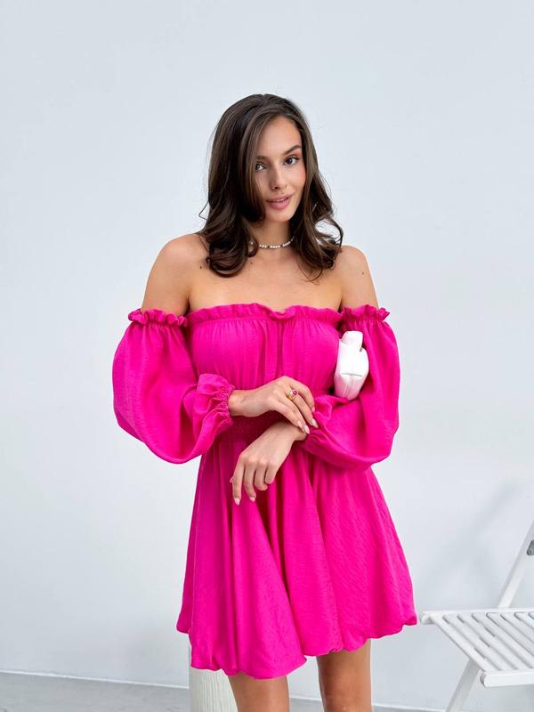 Колір: чорний , білий , малина Розмір: 42-52 ( універсал) Матеріал: льон-шовк , хлопок 100% Легка сукня з рукавами воланами, утягуючою резинкою на талії, яка візуально зменшує її Юбка на підкладці, яка надає пухкості виробу