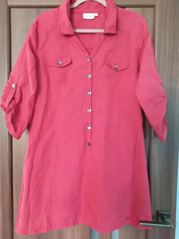 Лляна сукня/туніка красивого рожево-червого ( можливо, ніжно-малинового) кольору від Adini ( компанія була заснована у Великобританії і виготовляє класичний одяг з натуральних тканин). Складник тканини 💯% льон. Гудзики натуральні з мушлі. Довжина (від плечового шва) 87 см, пог - 56, пос-59, пот - 51, ширина по лінії плечей - 43, довжина рукава від горловини - 61.