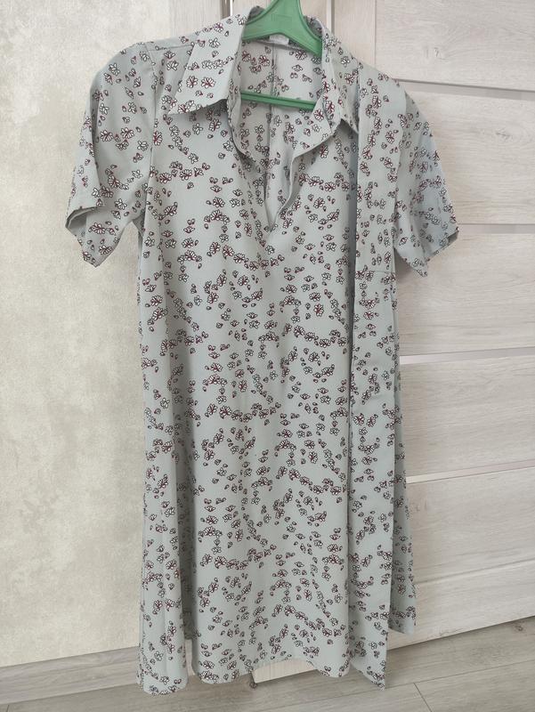 Легкое свободное платье-трапеция с вырезом у горловины и воротником, выполненное из софта. Модель расклешенного укороченного кроя с короткими рукавами и съемным поясом.