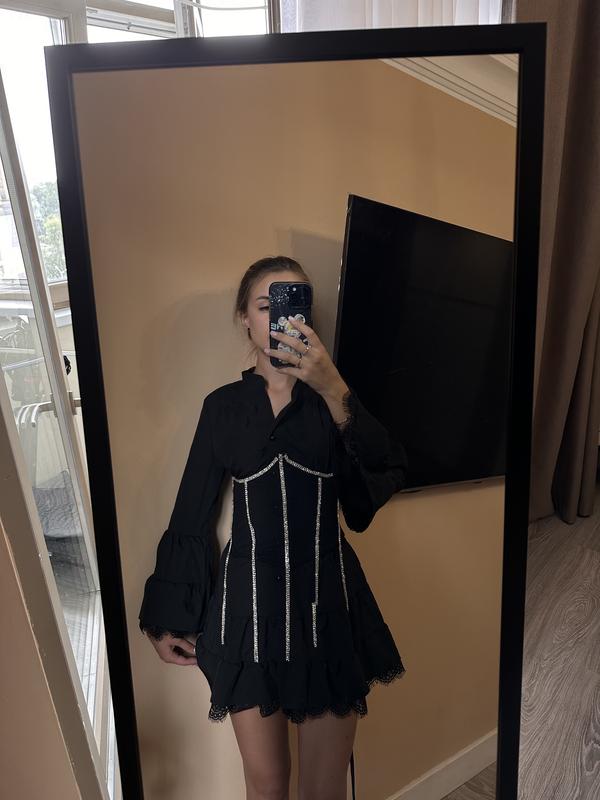 черное короткое платье с длинными рукавами. Платье украшено корсетом с полосками из блестящего материала, которые подчеркивают талию и создают эффект. Рукава у платья широкие, с объемными манжетами. Внизу платье имеет легкие оборки, которые добавляют объем и делают его более романтичным. Кружевные детали на рукавах и по низу платья добавляют изящества и элегантности.