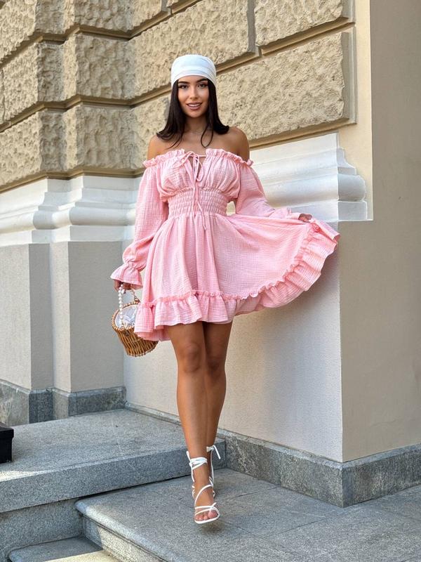 Муслиновое платье, которое подчеркнет твою женственность мод: 0654 Размеры: 42-44 46-48 Ткань: Натуральный Муслин Цвет: Нежно розовая, Морская волна, Желтый Идеально садится по фигуре, можно носить как с объемными рукавами так и со спущенными плечами. На груди регулируется завязками.