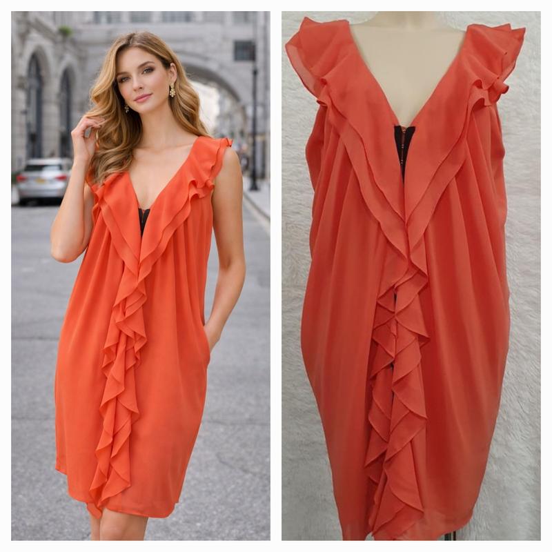 Очень славное платье с длинным воланом жабо. И декоративной планкой с крючками по переду. Размер 14 ХЛ. За счёт фасона садится отлично Л/ХЛ. Пог 54см Поб 56см Длина 100см Вопросы до оплаты.