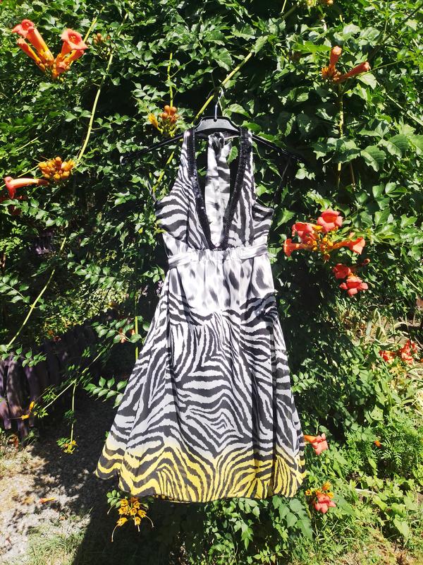 Очень красивое платье в трендовый анималистичный принт, украшенное пайетками, которые очень красиво сверкают на солнышке.