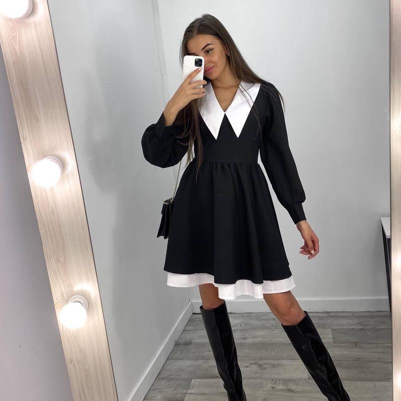 Сукня Эффектное и нарядное платье мини с акцентом в виде белого воротника. Это платье подчеркнет вашу фигуру и сделает ваш образ незабываемым. Платье с подъюбником. Размеры: 42-44, 44-46 Тканина: костюмка+котон Цвет: черный