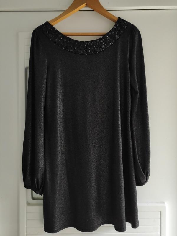 Нарядное люрексовое платье-трапеция с горловиной украшенной пайетками и камнями.С красивым, расширенным к низу рукавом. Пог-46-52 Пот-46-47 Поб-54-59 Длина-85 Дов.рукава от горловины-69