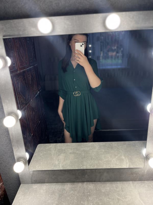 Платье с поясом,верх в виде рубашки,перед и зад удлиненные, по бокам укорочено,размер S-M