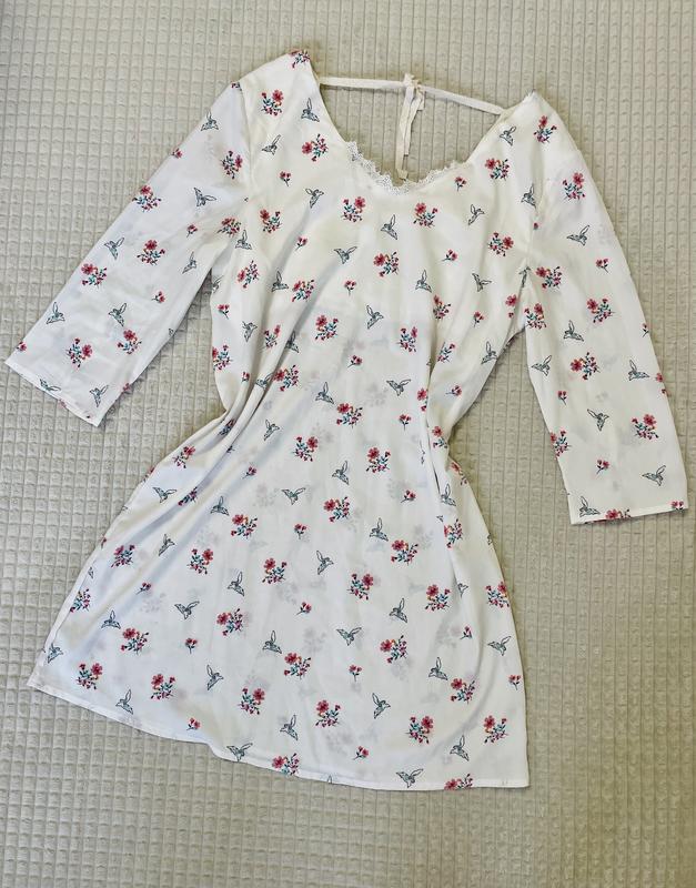 Летнее платье в цветочный принт с хлопковым кружевом, на спинке есть завязка. Подойдет на размер S/M. В хорошем состоянии, без дефектов.