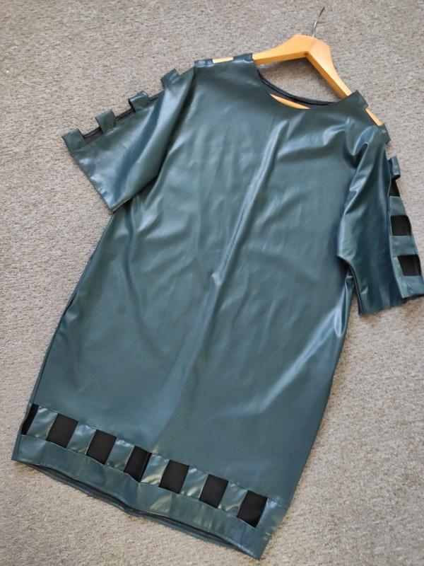 Платье из экокожи нова.Не подходит размер (бирочки нет),темно-зеленого цвета.С карманами. Пог-55 Пот-52 Поб-56 Длина-93 Дов.рукава от горловины-46