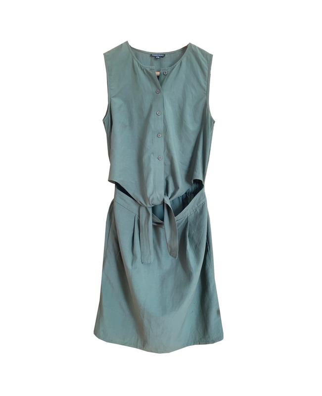 Легкое летнее платье от Warehouse оригинального фасона с разрезом и завязкой на животе. Ткань смесь вискоса с хлопком, тонкая, очень приятная на ощупь. Размер 10/38.