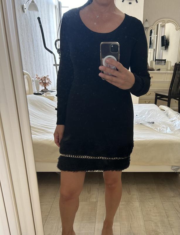 Платье теплая легкой вязки черного цвета, очень приятное к телу. Снизу декор в виде искусственного меха и золотой цепи. Размер М