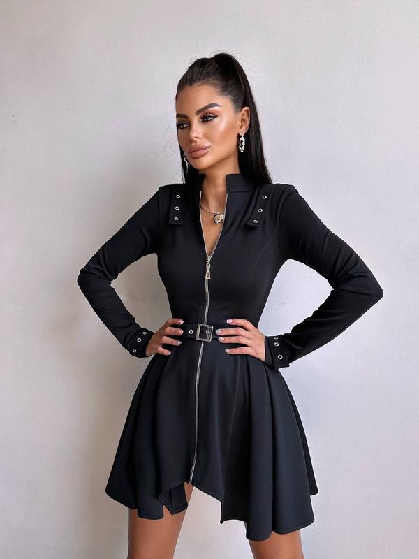 Платье с пышной юбкой и поясом на молнии, платье мини с длинным рукавом на молнии
