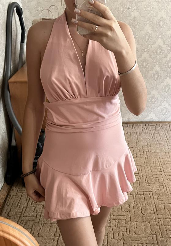 Розовое платье в идеальном состоянии Открытая спинка Юбка шортами Размер М Одягнена на параметри: • рост - 162 см • грудь - 92 см • талия - 68 см • бедра - 93 см