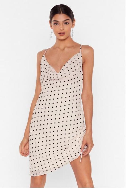 Мини-платье цвета нуд в черный горох NASTY GAL Бренд: NASTY GAL; Цвет: черный, бежевый; Размер: 38/M/46; Материал: полиэстер; ПОГ: 50 см; ПОТ : 39 см; Длина изделия по спине: 71 см.