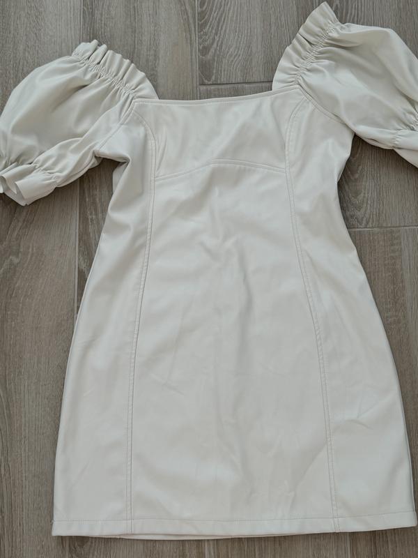 Крутое молочное платье из эко кожи, очень красиво ложится по фигуре, рукава фонарики, сзади имеет скрытый замок